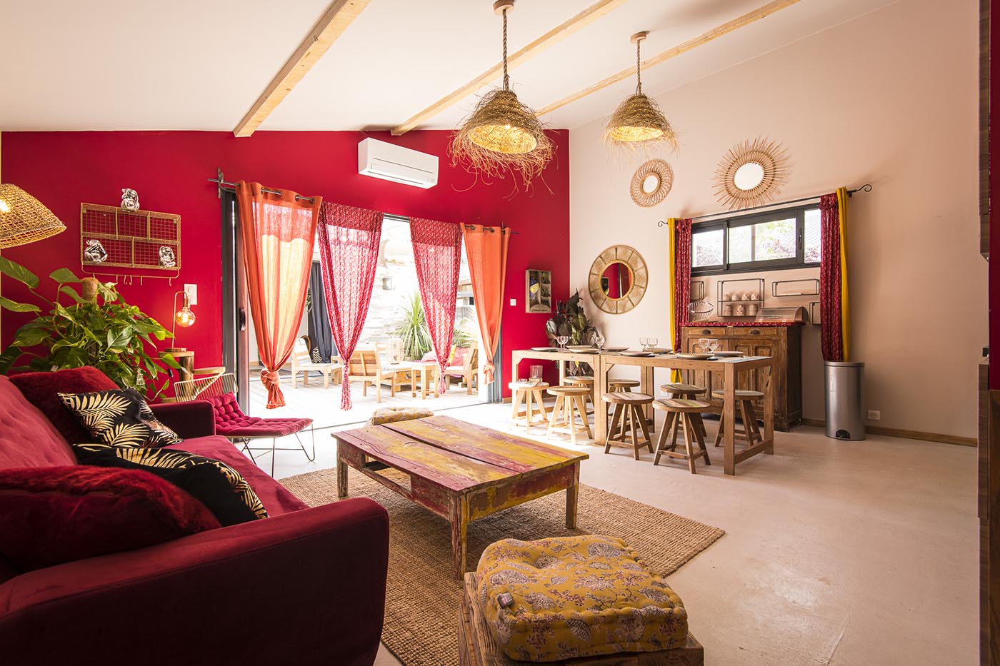 - Chambre 2 : 15 m² – Lit Queen size (160×200) + salle d’eau privative avec douche à l’italienne, vasque et toilettes suspendues